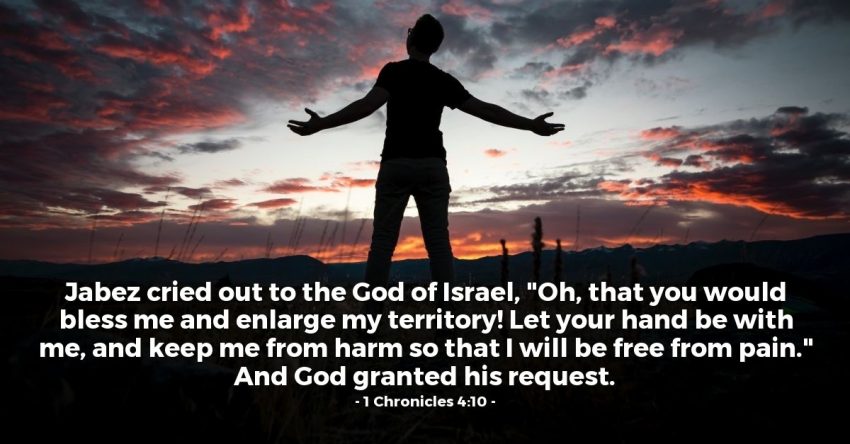 1 Ch 4:10 β βAnd Jabez called on the God of Israel saying, βOh, that You would bless me indeed, and enlarge my territory, that Your hand would be with me, and that You would keep me from evil, that I may not cause pain!β So God granted him what he requested.β Jabez was a…